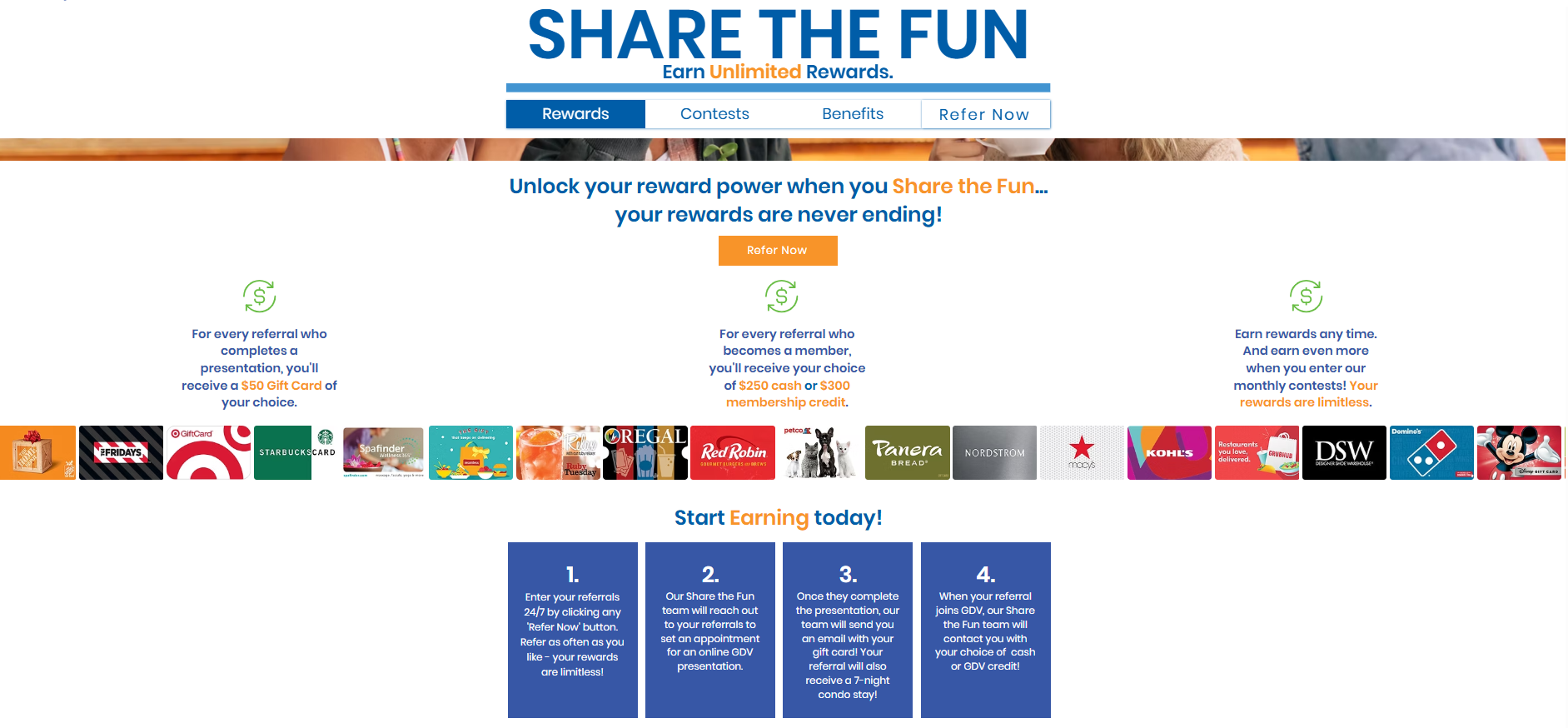 Click on the "Refer Now" button and fill in the required information for your referrals. We must have their name and email address in order to send them an invitation to book their presentation. To earn a $50 digital gift card for referring friends, family, and co-workers, your qualified referral must complete a presentation. Upon completion of their presentation, your referrals will receive a certificate for a 8-day, 7-night condominium stay (restrictions apply).